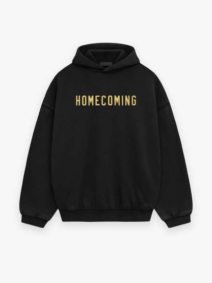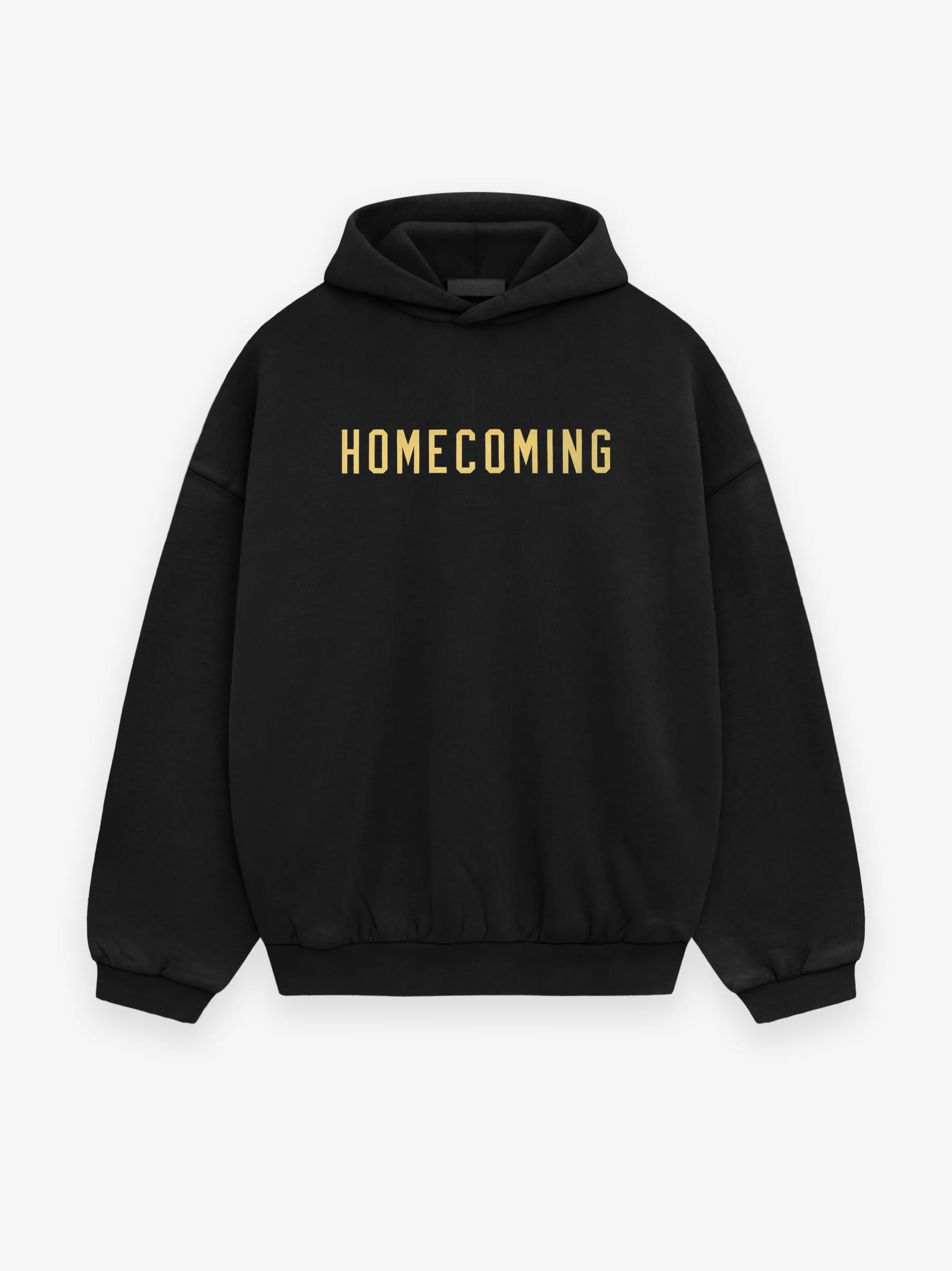 The Heavy Fleece Hoodie is made from heavyweight 520gsm, 100% cotton fleece with a subtle vintage wash. The designed volume creates a round, cropped silhouette. A collegiate-inspired "Homecoming" graphic is screen-printed on the front. Details include an overlapped neckline hoodie, rib-knit cuffs, waist-hem, and side pockets. The Essentials Fear of God rubberized label is stitched on the hood.
